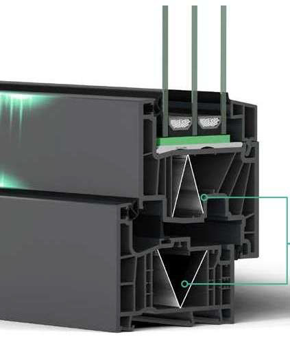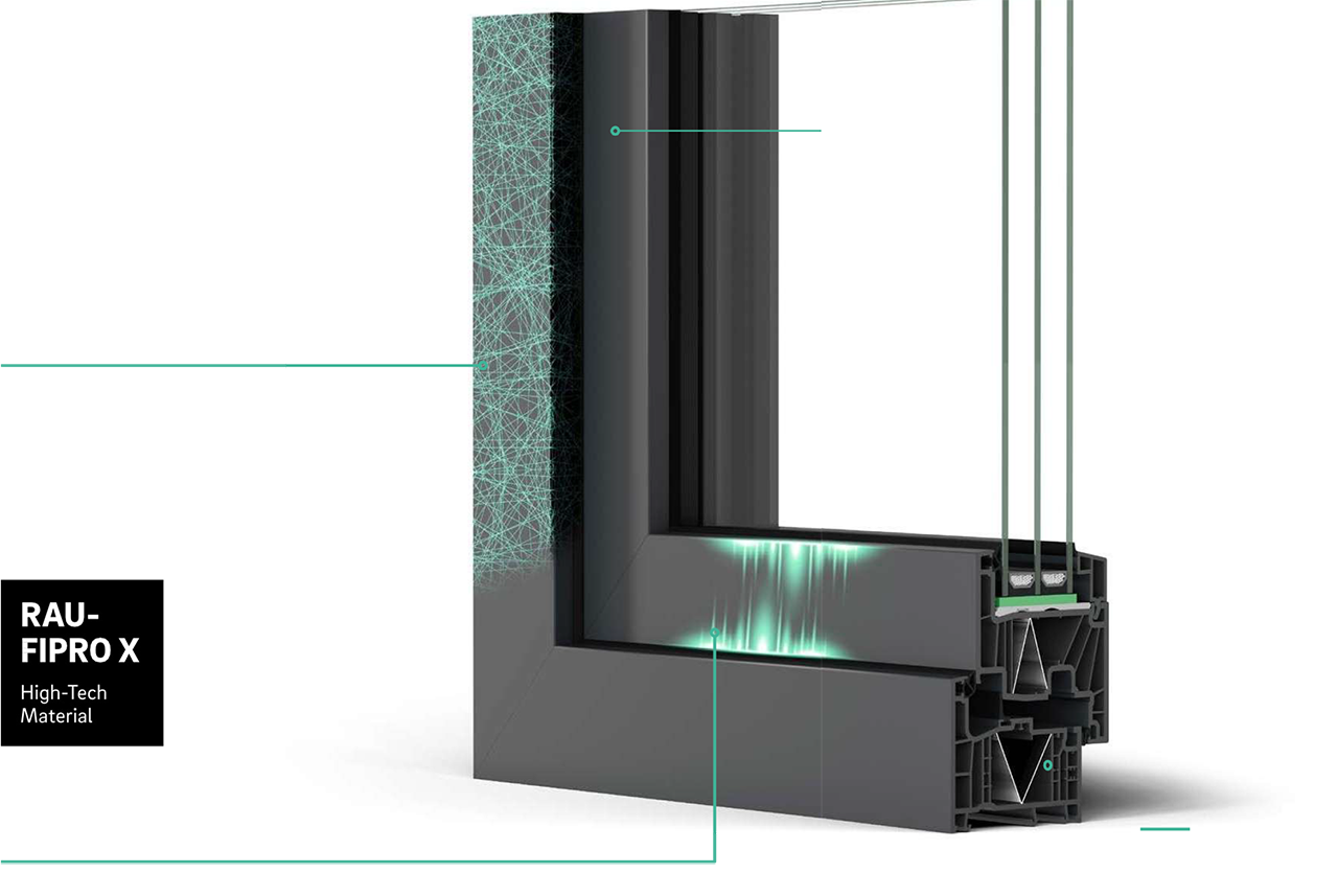 Η ενσωμάτωση του ινοενισχυμένου σύνθετου υλικού σε ολόκληρη τη διατομή των προφίλ παραθύρων ARTEVO φροντίζει για μια απόλυτα ομοιόμορφη και αξιόπιστη μεταφορά των φορτίων.